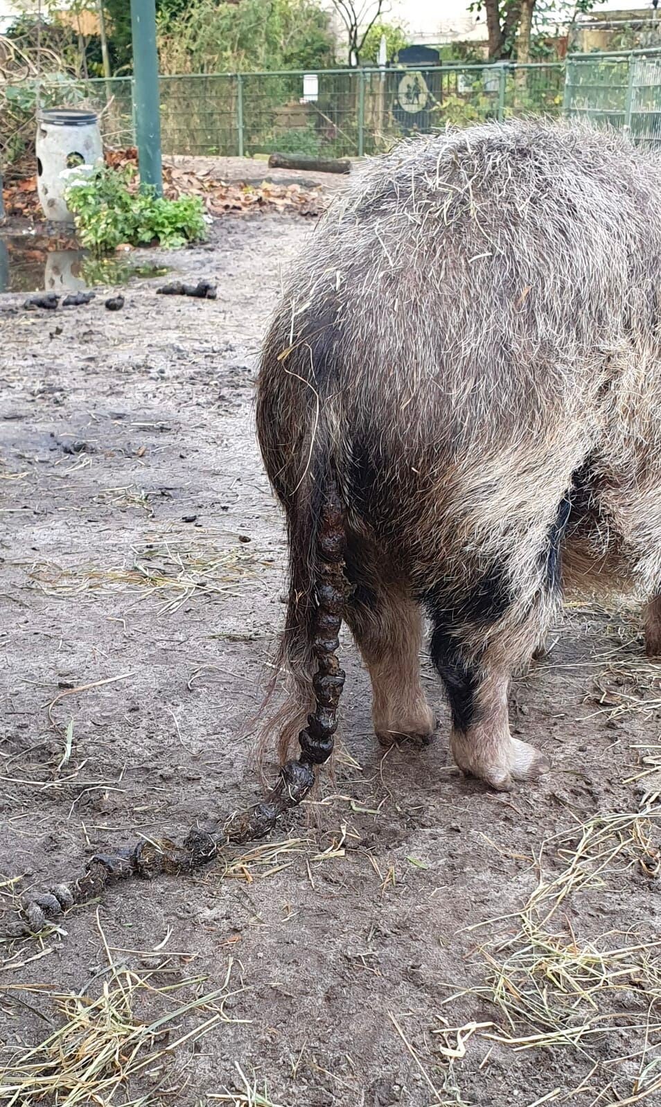 “Maak je geen zorgen: dit is geen zieke varkenspoep, maar gewoon een ‘kralenketting’ van keutels die met hooi-vezels aan elkaar vastzitten 🐷💩. Onze Kune Kune-varkens krijgen extra hooi zodat hun maag goed gevuld is, ze minder honger hebben én niet te dik worden 🌾💚. Voldoende vezels is belangrijk voor een gezonde spijsvertering – ook als de mest er soms een beetje gek uitziet